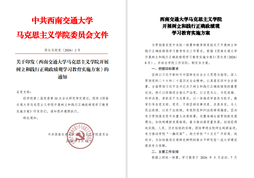 会议审议并通过了《西南交通大学马克思主义学院开展树立和践行正确政绩观学习教育实施方案》(以下简称《实施方案》),明确了学习教育的总体目标、主要工作安排和组织保障,为学院系统开展学习教育提供了制度保障和行动指南。学习教育计划于2026年3月启动、7月底基本结束,坚持聚焦主题、简约务实,从学院党委和师生支部两个层面,把学习研讨、查摆问题、整改整治、建章立制、开门教育贯通融合、一体推进。会上,全体班子成员还结合学院中心工作和各自分工,对照政绩观偏差主要问题清单和“8+6”个方面问题清单,进行了认真查摆。针对查摆出的问题,全体成员一致表示,要端正态度、正视差距,坚决抓好整改落实。下一步,将逐条制定整改措施,做到即知即改、立行立改,以实际行动体现政绩观的根本转变。