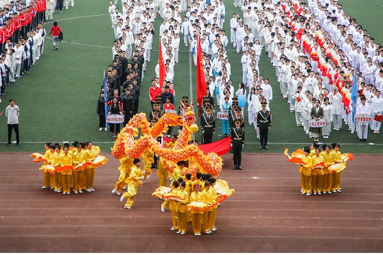 在开幕式方阵中,我院第十七个出场。教师们身着统一运动服,精神饱满地展现了立德树人的理想信念。女生手持扇子呈六乘六的方阵,男生舞动金龙,大家身着印有“精气神”的黄色太极服。“马列领航、勇创辉煌,复兴交大、扬帆远航”的口号响振整个田径场。我院在开幕式中表演了舞龙和扇子舞,展现了学院龙马精神、一马当先,复兴交大、勇创辉煌的昂扬斗志,博得了全校师生雷鸣般的掌声和喝彩!