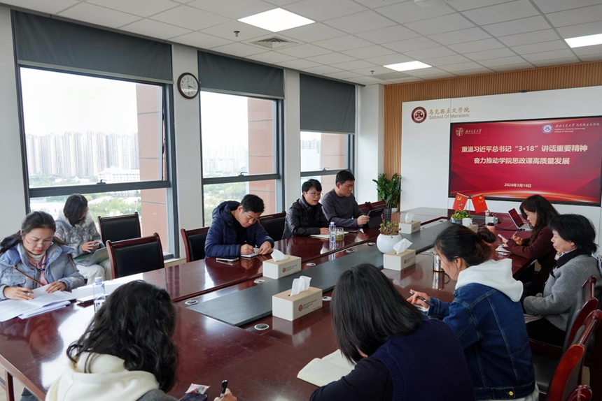 为持续深入学习贯彻习近平总书记在学校思想政治理论课教师座谈会上的重要讲话精神,进一步推动新时代思政课建设发展,2026年3月18日,学院召开专题学习与工作推进会,重温习近平总书记“3·18”重要讲话精神,总结教学成果,分析当前形势,部署重点任务,奋力推动学院思政课建设高质量发展。会议由学院副院长章娟主持,各教研室主任参加会议。