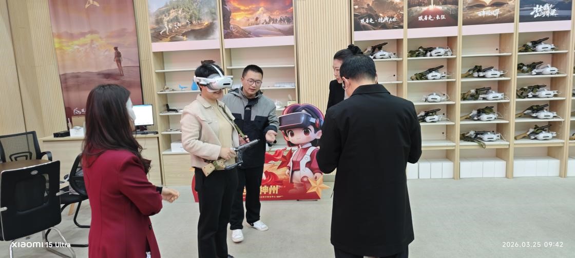 在威爱科技相关负责人陪同下,我院团队首先参观了AI+XR主旋律沉浸式数字服务中心。该中心全面集成人工智能,元宇宙、数字孪生多模态内容生成等多项前沿核心技术,构建起高度沉浸、强交互、可感知的数字化教育场景。通过头戴式显示设备与智能交互系统,体验者能够“走进”百年党史中的重要历史时刻,身临其境地感受革命先辈的奋斗历程。