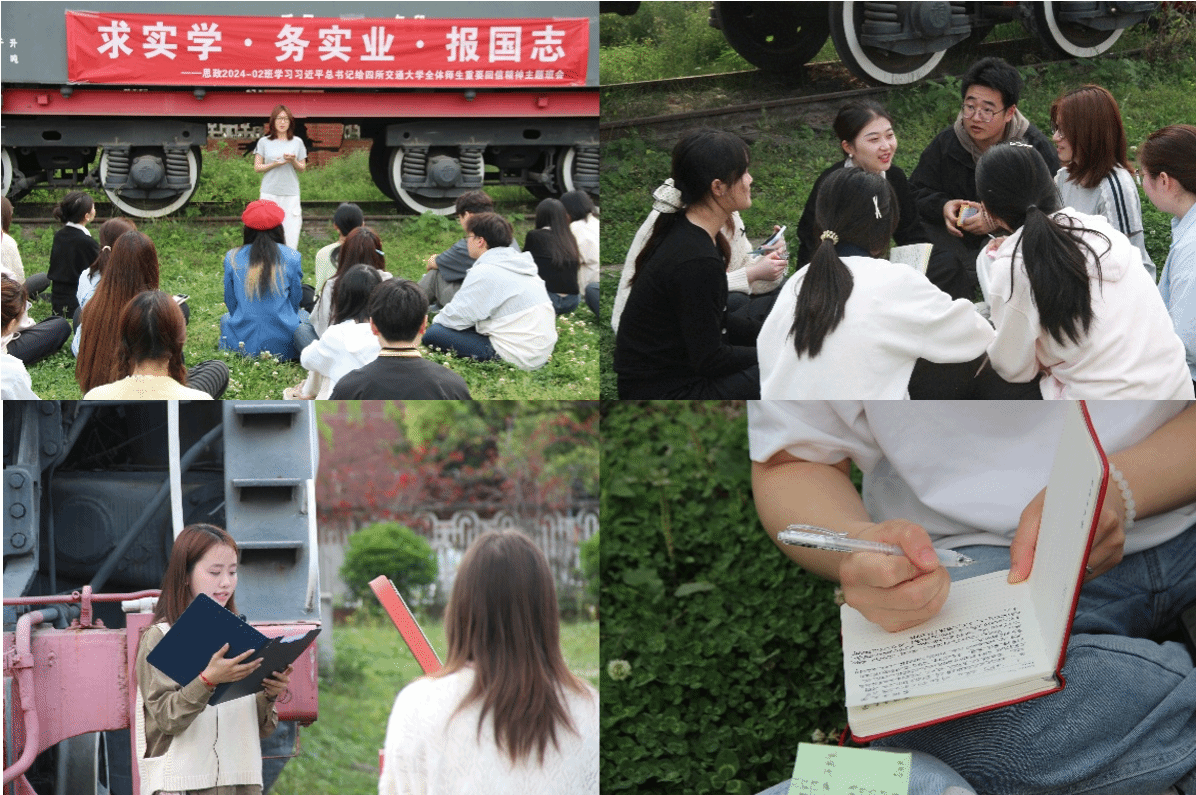 与此同时,在交通强国科学家精神教育基地(西南交通大学机车博物园)里,马克思主义学院思政2024-02班正在开展“求实学·务实业·报国志”学习习近平总书记重要回信精神主题班会。全班同学在班长王照涵的带领下,在机车前重温回信原文,感悟初心使命。班会分为现场导入、回信精神传达、主题导学、分组讨论、总结倡议和合影留念六个环节。团支书陈柯妤全文朗读回信并提炼了“求实学、务实业”办学宗旨、传承西迁精神、加强科技自主创新与人才自主培养等核心要求。学生代表朱古力从马克思主义理论专业视角出发,围绕“思政人的责任”作导学分享,以自己的切身体会向大家分享总书记重要回信对思政学子的指导意义。