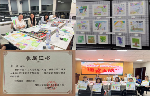 工作坊分别邀请马克思主义学院党委副书记邓秀芸、计算机与人工智能学院党委副书记肖静、四川大学学工部艺术教育中心教师令狐波、外国语学院辅导员赵敏聪、机械工程学院辅导员张翔、马克思主义学院辅导员赵子涵担任导师。首期工作坊中,令狐波带领学员们以“种子的漂流”为主题开展接力绘画创作,帮助学员具象化内心期待,更通过对他人画作的即时解读触发自我认知反思。“个体独特性”与“集体共生性”在这次艺术与心灵的沟通中得到直观呈现,生动诠释了“每个人都是独特星球”的理念。同学们的作品还应邀参加了四川大学“绘川心画”美育疗愈艺术创作展。